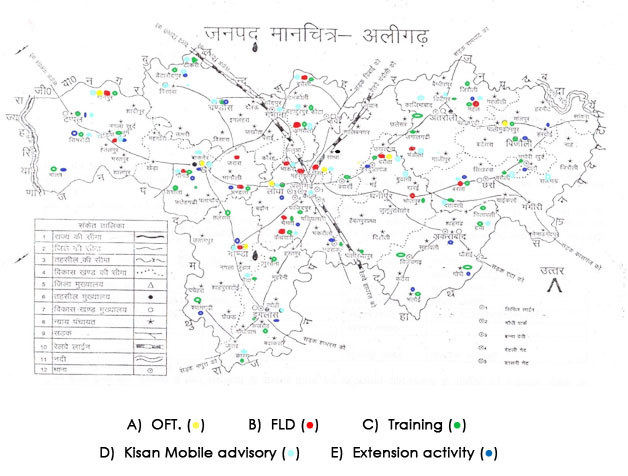 Krishi Viyan Kendra, Aligarh is working with farming community in accordance to the mandate of KVK which includes On Farm Trial, Front line Demonstration, On Campus & Off Campus Training Programme, and other extension activities. During last three years through OFT & FLD KVK Aligarh introduced latest technology amongst farmers viz., Integrated Nutrient Management, Integrated Pest Management, Crop Diversification, Use of Biofertilizers, Production vermin-compost and their use in crop field to improve soil fertility, Use of Bio-agents viz. Trichoderma virdae, buveria bassiana, Trichogramma card to control insect pests & diseases through biological means and to reduce use of chemicals. In horticulture farmers were aware about hybrid vegetable cultivation, floriculture, fruit crops cultivation and resourse conservation technologies.